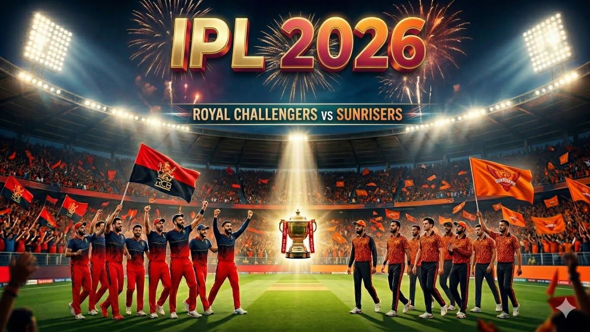 IPL 2026 का ओपनिंग मैच RCB और SRH के बीच रोमांचक मुकाबला होगा। RCB की मजबूत बल्लेबाजी और SRH की नई कप्तानी के बीच कड़ा मुकाबला देखने को मिलेगा। इम्पैक्ट प्लेयर और चिन्नास्वामी की पिच मैच का रुख तय कर सकते हैं।